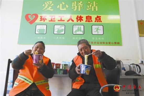 近年来,丰润区建立3处“环卫驿站”,内设空调、饮水机、微波炉、座椅,为环卫工人免费提供饮水、热饭、针线包等服务,用实际行动温暖工作在一线的“城市美容师”。图为环卫工人在“环卫驿站”享用爱心人士提供的免费早餐。