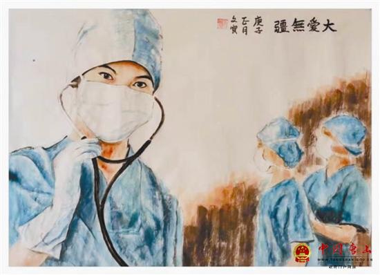 图为展现医护人员抗击疫情的绘画作品《大爱无疆》。