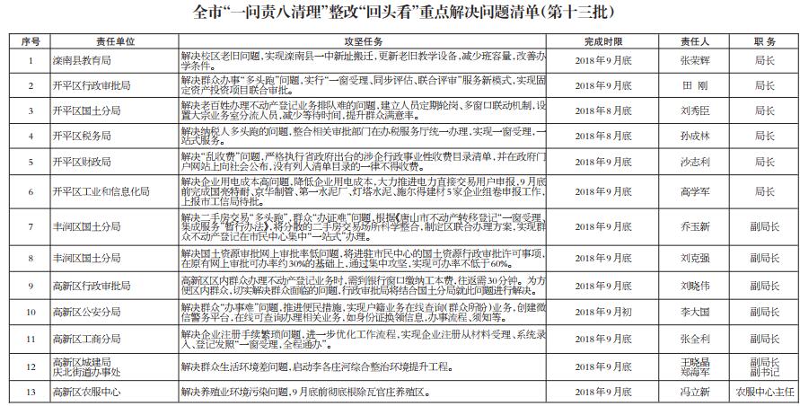 为进一步推动全市“一问责八清理”整改“回头看”向纵深发展,经市领导小组决定,在全市开展为期三个月的“找准问题症结、合力集中攻坚专项行动”,确实解决一批社会关注度高、企业和群众所忧所盼所急的热点、难点问题,更好地提升企业和群众的获得感,进一步打造“四最”营商环境。现将纳入攻坚行动的第十三批任务清单予以公示,作出承诺,接受社会各界监督,监督电话0315-2806366。