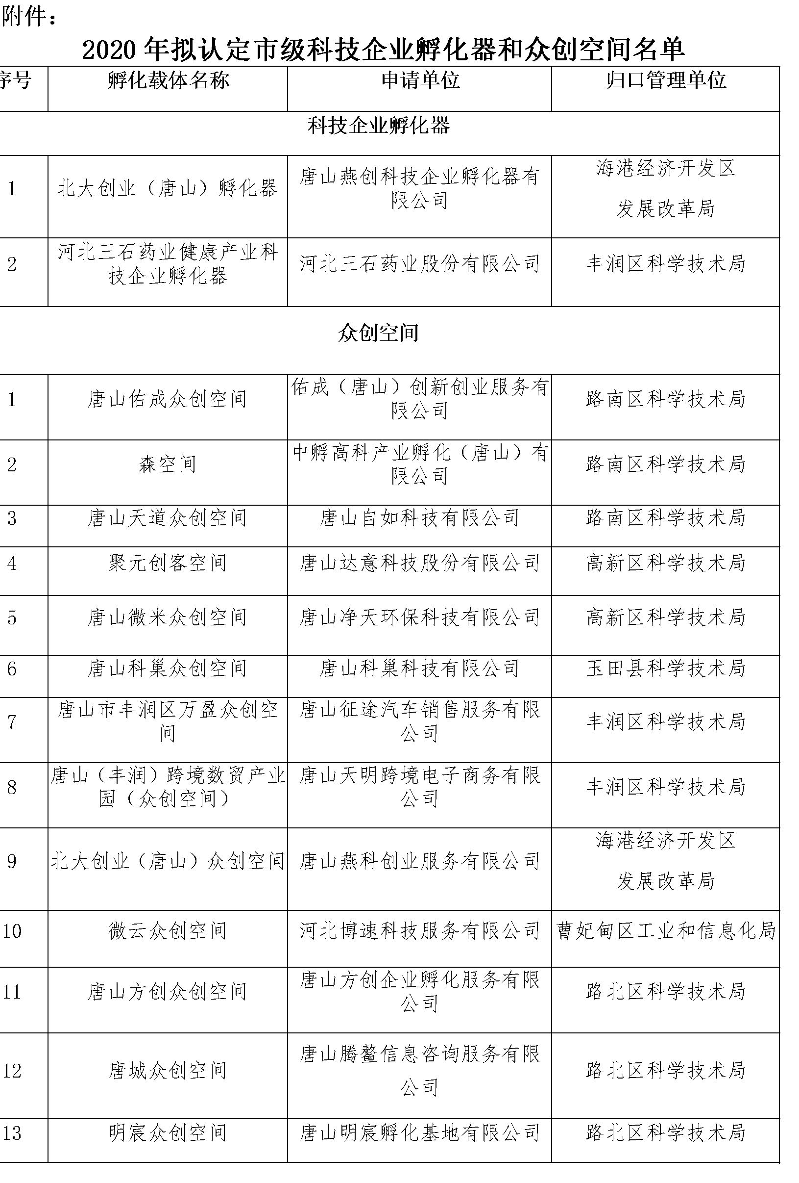 根据《唐山市科技企业孵化器认定和管理办法》(唐科规字〔2020〕1号)和《唐山市众创空间认定和管理办法》(唐科规字〔2020〕2号)等文件精神,经运营单位申请、归口管理部门推荐、专家评审、局党组会研究确定,拟将北大创业(唐山)孵化器等2家孵化器和唐山佑成众创空间等13家众创空间纳入市级管理序列。现予以公示,公示期从2020年8月27日至9月2日。